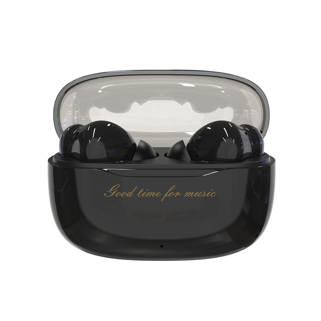 The lightweight headphones fit perfectly in the ear, offering hours of comfort. A black case with a transparent cover highlights their modern style.