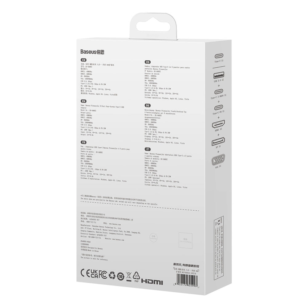 Baseus PioneerJoy 8-i-1 USB-C hub HDMI 4K@60Hz + HDMI 4K@30Hz + DisplayPort 8K@30Hz + VGA + 2 x USB-A 3.0 + 2 x USB-C - grå .