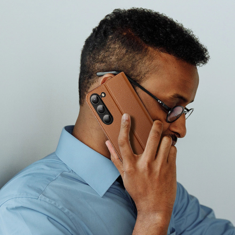Samsung Galaxy S23+ case from the Dux Ducis Skin X2 series with a flap in brown