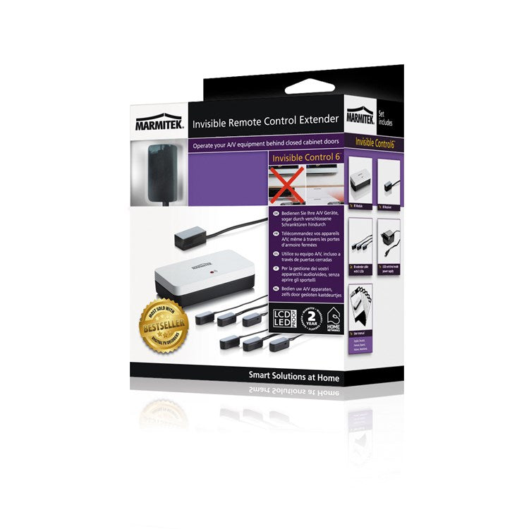 Betjen op til 6 enheder inde i et lukket kabinet ved hjælp af din egen fjernbetjening. Marmitek Invisible Control 6 gør det muligt at betjene udstyr inde i et lukket kabinet. Sættet består af en modtager, et modul og 6 sender-LED'er. Du holder en sender-LED på hver enhed, du vil betjene. Dette giver dig mulighed for at betjene op til 6 enheder, der er inde i et lukket kabinet, ved hjælp af din egen fjernbetjening.