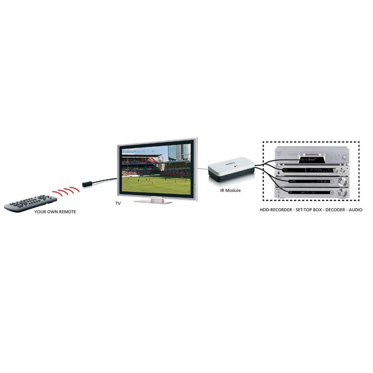 Du placerer modtageren inden for fjernbetjeningens synsfelt og har den tilsluttet det modul, du placerede inde i kabinettet. Du tilslutter derefter senderen til modulet. Fjernbetjeningens signal transmitteres via modtageren til modulet, som igen sender signalet til senderen / senderne. Senderen 'betjener' derefter dit audiovisuelle udstyr. Dette sikrer, at du ikke behøver at åbne nogen skabsdøre for at betjene dit udstyr.