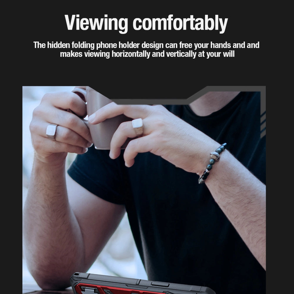 Ein integrierter Ständer in Form einer Objektivabdeckung ermöglicht die horizontale oder vertikale Positionierung des Telefons. Vergessen Sie das ermüdende Gefühl, Ihr Telefon stundenlang in den Händen zu halten, während Sie Filme schauen oder lesen.