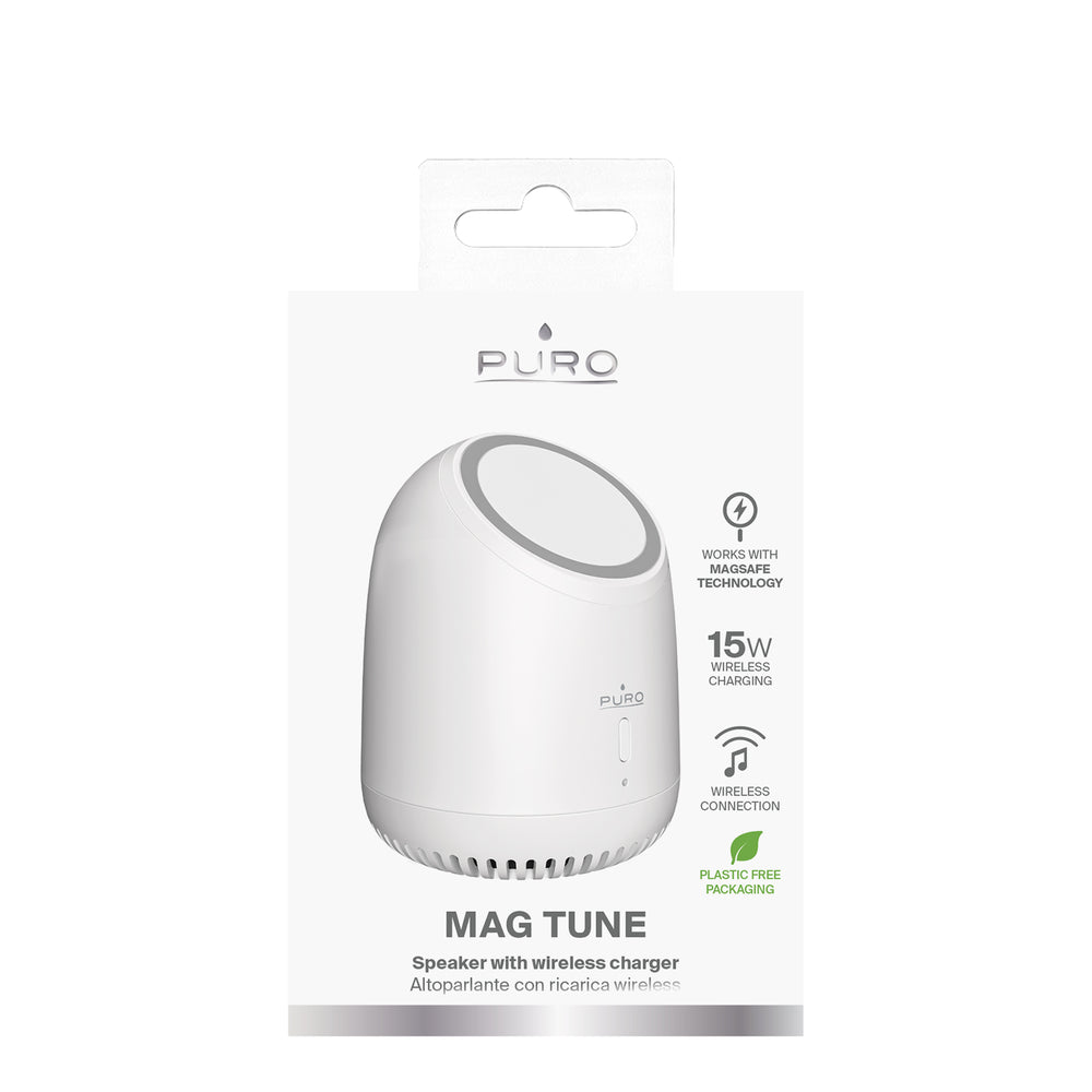 Oplev den trådløse højttaler Magtune fra Puro med 15W opladning og 5W højttaler.