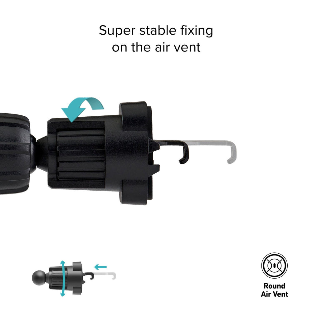 Mobilholderen er udstyret med en klip, som kan skrues på udluftningsgitteret i din bil, om den er firkantet eller rund. Denne funktion betyder, at holderen er kompatibel til næsten alle biler.