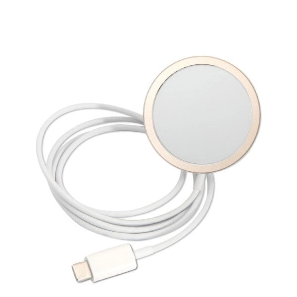 Stylowa ładowarka indukcyjna w złotym kolorze, pozwalająca na ładowanie kompatybilnych smartfonów bez potrzeby podłączania ich do ładowarki. Dzięki idealnie dopasowanym magnesom mocno przywiera do urządzenia, co przyspiesza uzupełnianie energii. Po prostu przyłóż urządzenie bezpośrednio do ładowarki a Twój telefon automatycznie zacznie się ładować.