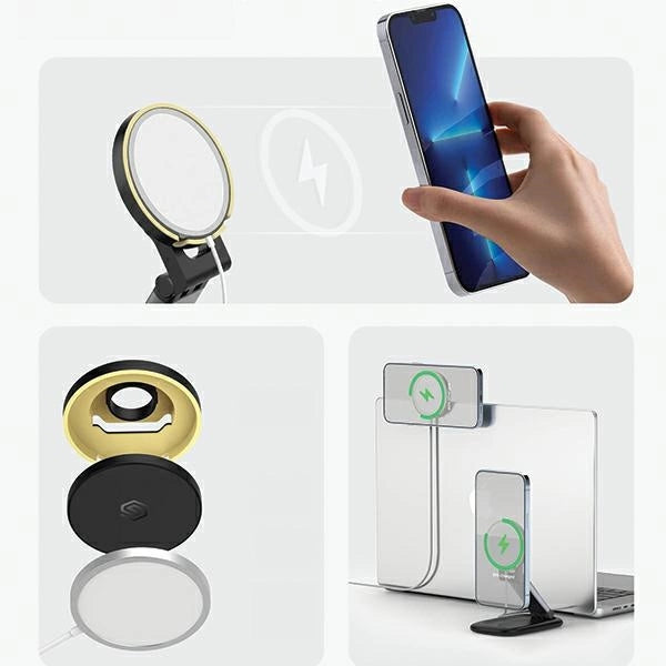 SODI BM 310 Magnetic stand for iPhone 15/14/13/12 series, compatible with the Apple MagSafe wireless charger. The stand features a foldable and adjustable camera mount. The magnetic phone holder can be removed from the base and attached directly to the laptop.