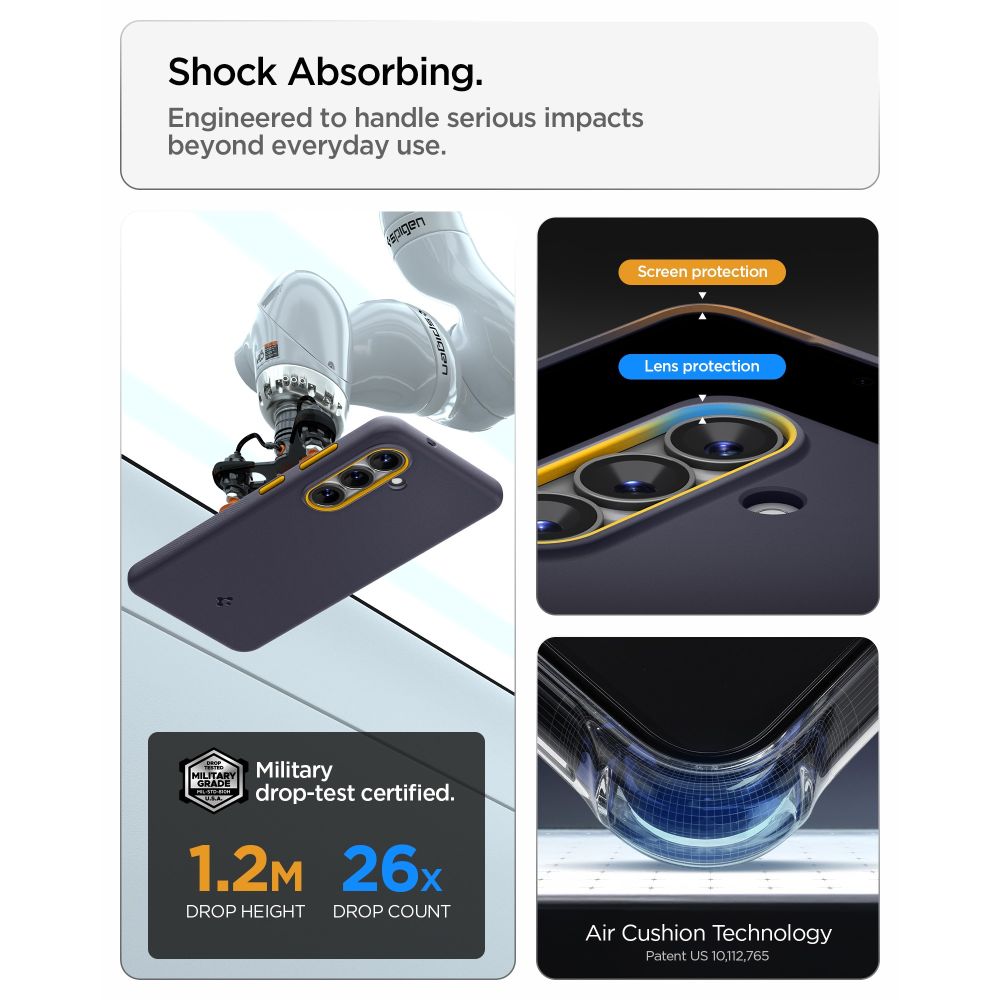Producent zastosował technologię Air Cushion w narożnikach, tworząc przestrzenie powietrzne, które dodatkowo amortyzują uderzenia i zabezpieczają urządzenie w momencie upadku. Kolorowa ramka wokół aparatu unosi obiektyw ponad powierzchnię, zapewniając ochronę przed zarysowaniami i kontaktem z różnymi powierzchniami, jednocześnie nadając całości charakterystycznego, stylowego wyglądu. Matowe wykończenie gwarantuje pewny, antypoślizgowy chwyt, a lekka i smukła konstrukcja sprawia, że etui nie przeszkadza w codziennym użytkowaniu.