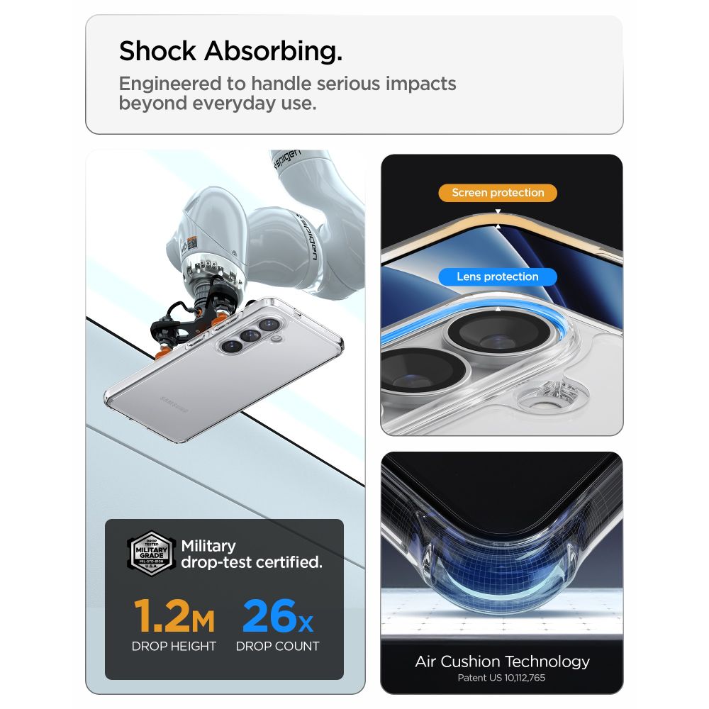 Das Ultra Hybrid wurde einem Härtetest unterzogen und nach MIL-STD 810G-516.6 zertifiziert. Das bedeutet, es wurde 26 Mal aus einer Höhe von 2 Metern fallen gelassen. Alle Spigen Produkte werden auf Abriebfestigkeit und Passgenauigkeit geprüft, um eine hohe Qualität zu gewährleisten.