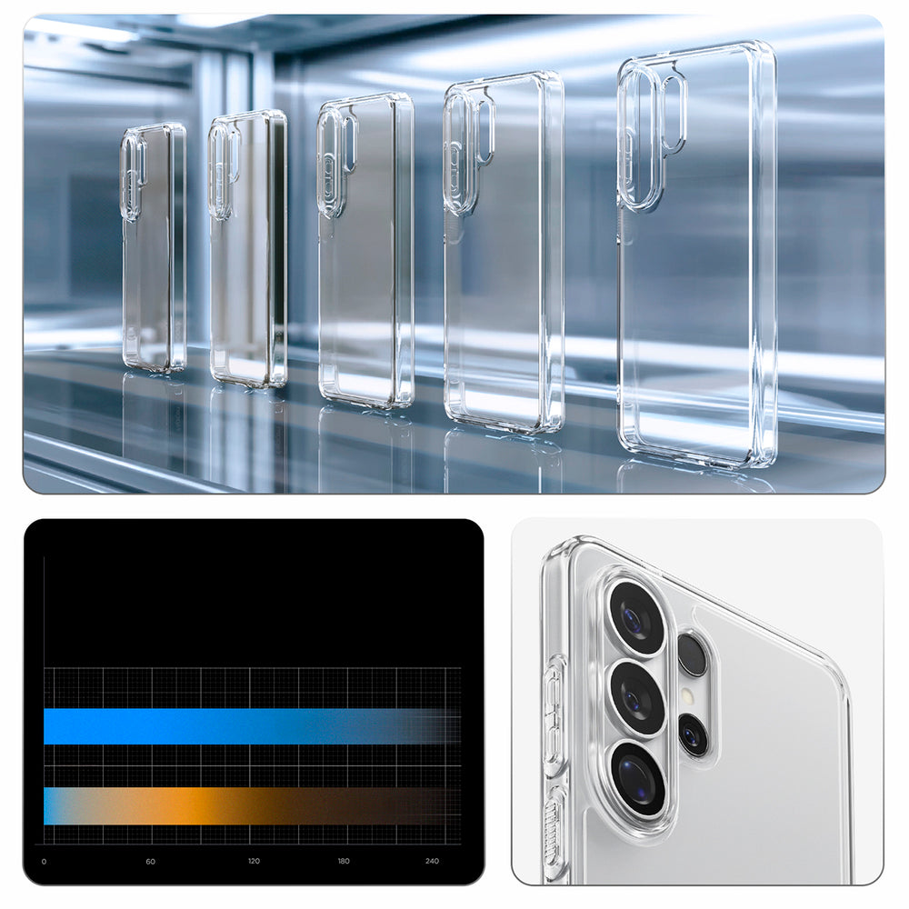 The Ultra Hybrid case from Spigen combines minimalist design with top-tier protection. Made of durable, flexible TPU material, it securely encloses the entire device, providing excellent shock absorption. Additionally, it's complemented by a strong polycarbonate panel that protects against scratches and hardens the structure. The product is perfectly fitted, fully functional, does not restrict access to external ports, and effectively protects the phone during drops. The Ultra Hybrid is the perfect protective solution while maintaining minimal weight and thickness.