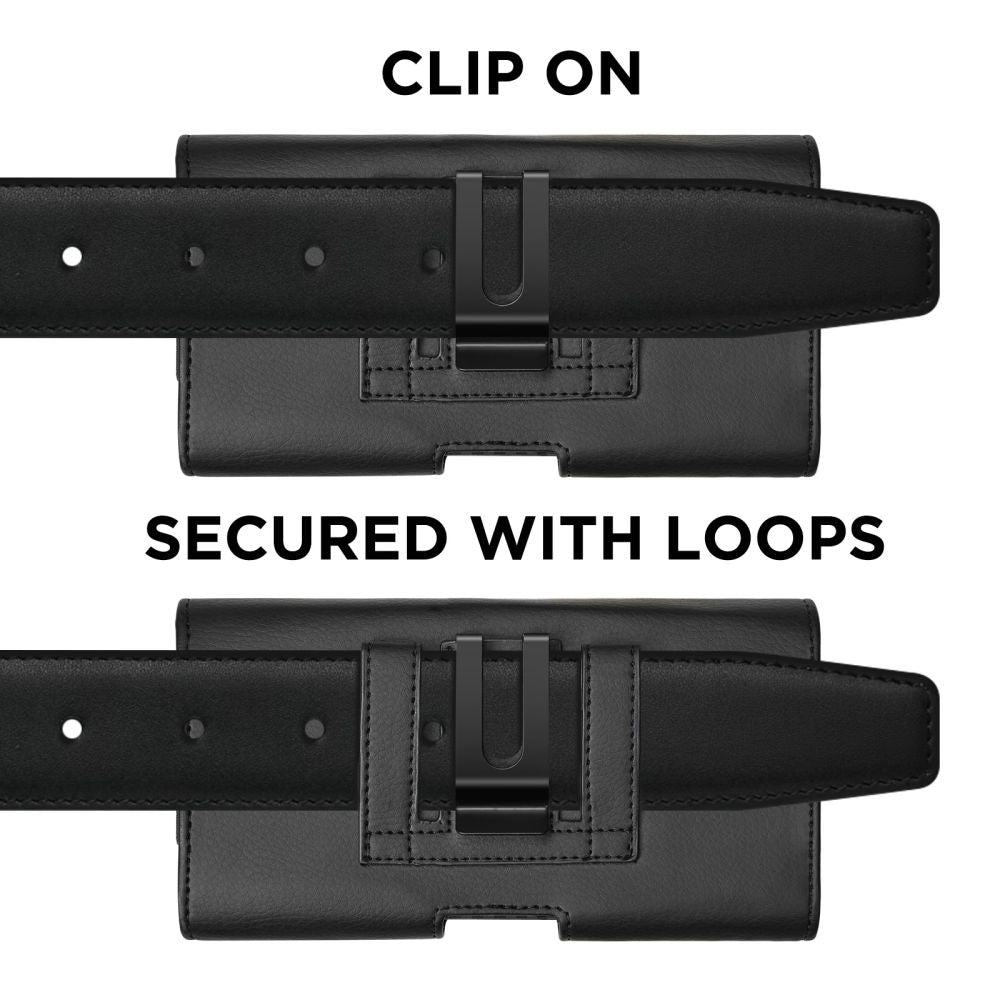 Für eine einfache Handhabung ist die Hülle mit einem robusten Gürtelclip und zwei zusätzlichen Gürtelschlaufen ausgestattet, die einen stabilen und sicheren Sitz gewährleisten – egal ob bei der Arbeit, auf Reisen oder beim Spazierengehen. Der Clip ist robust und stabil und sorgt für einen sicheren Sitz, während der Magnetverschluss an der Vorderseite ein versehentliches Öffnen der Hülle verhindert.
