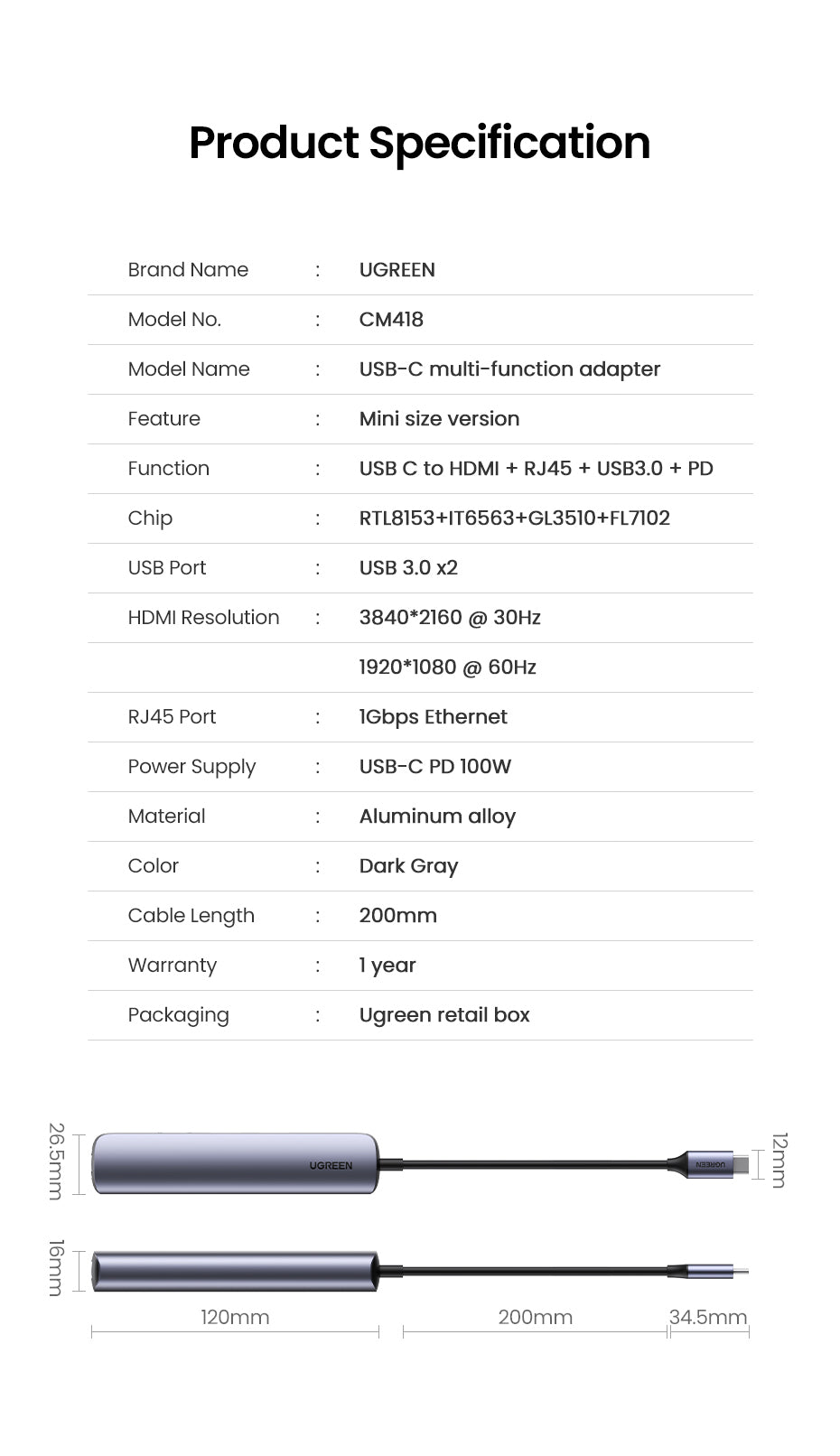 Ugreen 10919, Ledningsført, USB 3.2 Gen 1 (3.1 Gen 1) Type-C, 100 W, 10,100,1000 Mbit/s, Grå, Aluminium