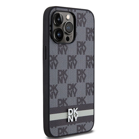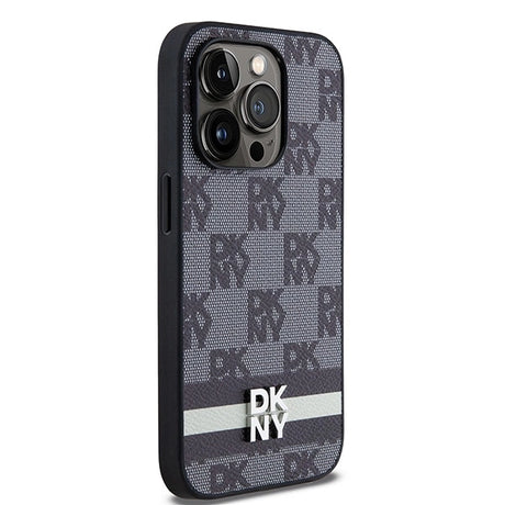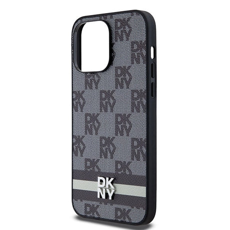 DKNY Leather Checkered Mono Pattern & Printed Stripes iPhone 15 Pro Case - Black