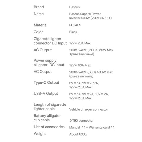 Baseus bilstrømsomformer 150W 12V / 500W 220V (EU- og KN-stik) sort (CGNB000101)