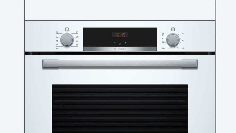 Bosch Serie 4 HBA534BW3. Ovn - størrelse: Medium, Ovntype: Elektrisk ovn, Samlet indvendig ovn kapacitet: 71 L. Placering af apparat: Indbygget, Produktfarve: Hvid, Kontroltype: Dreje, Berøring. Timer type: Digital. Energiforbrug (konventionel): 0,94 kWh, Energiforbrug (tvungen konvektion): 0,69 kWh, Energieffektivitetsskala: A+++ til D. Antal lamper: 1 Lampe( r), Lampe type: Halogen
