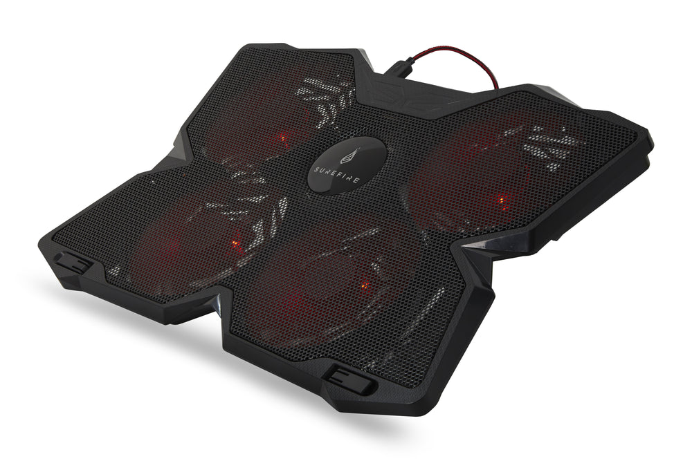 SureFire Bora. Maksimal skærmstørrelse kompatibilitet: 43,2 cm (17"), Antal indbyggede køleventilatorer: 4 stk, Ventilator diameter: 12 cm. Produktfarve: Sort, Materiale: Metal, Plast, Belysningsfarve: Rød. Værtsgrænseflade: USB, USB version: 3.2 Gen 1 (3.1 Gen 1). Strømkilde type: USB, Indgangsspænding: 5 V. Kabellængde: 0,68 m, Bredde: 408 mm, Dybde: 287 mm