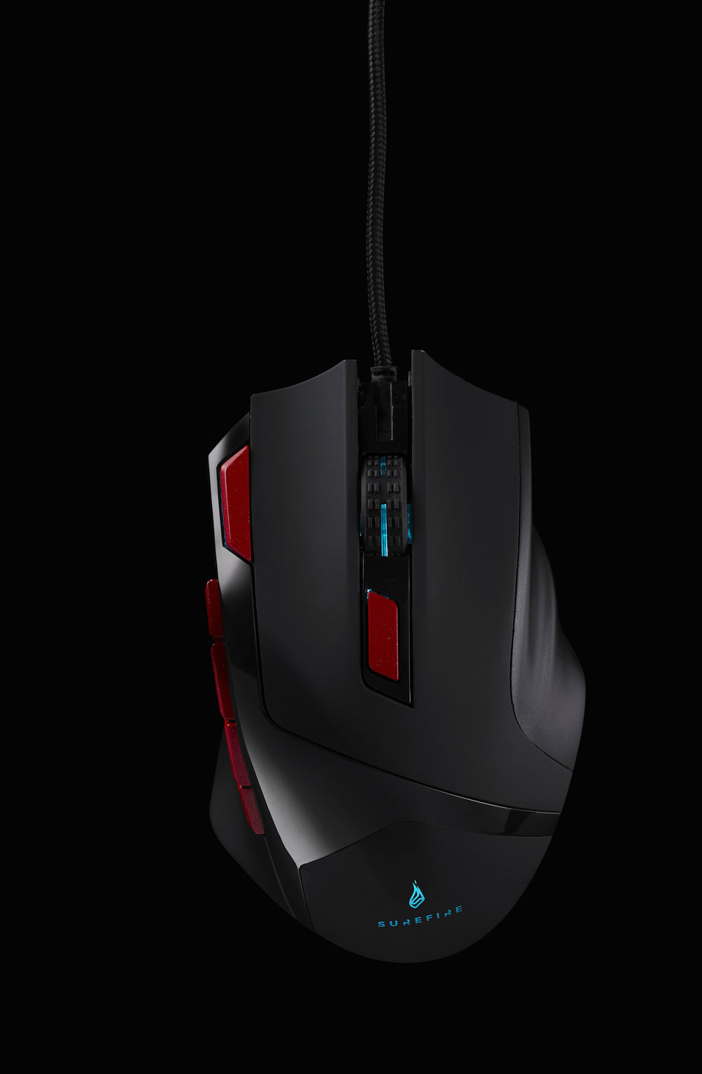 SureFire 48817. Formfaktor: Højre hånd. Bevægelsesdetekteringsteknologi: Optisk, Enhedsgrænseflade: USB Type-A, Bevægelsesopløsning: 3200 dpi, Billedhastighed: 6000 fps, Knapper type: Trykte knapper, Antal knapper: 9, Rulle type: Hjul, Acceleration (maks.): 22 G. Belysningsfarve: Blå, Grøn, Rød. Strømkilde: Kabel. Produktfarve: Sort