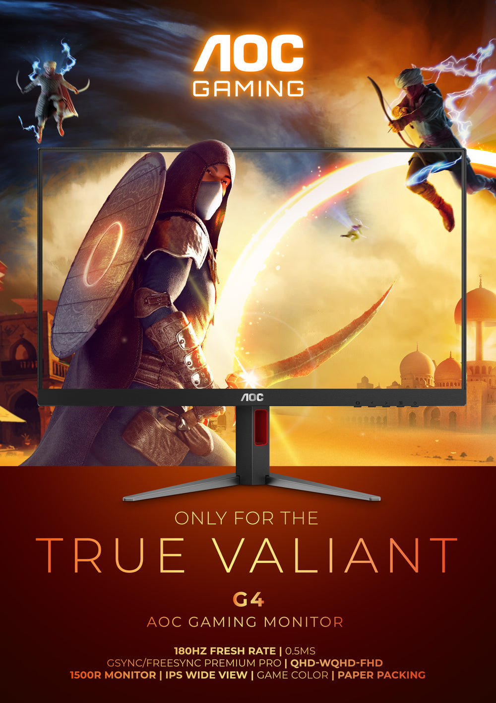 AOC G4 CQ27G4X. Skærm diagonal: 68,6 cm (27"), Skærmopløsning: 2560 x 1440 pixel, HD-type: Quad HD, Skærmteknologi: LCD, Responstid: 0,5 ms, Naturligt aspektforhold: 16:9, Synsvinkel, horisontal: 178°, Synsvinkel, vertikal: 178°. Højdejustering. Produktfarve: Sort