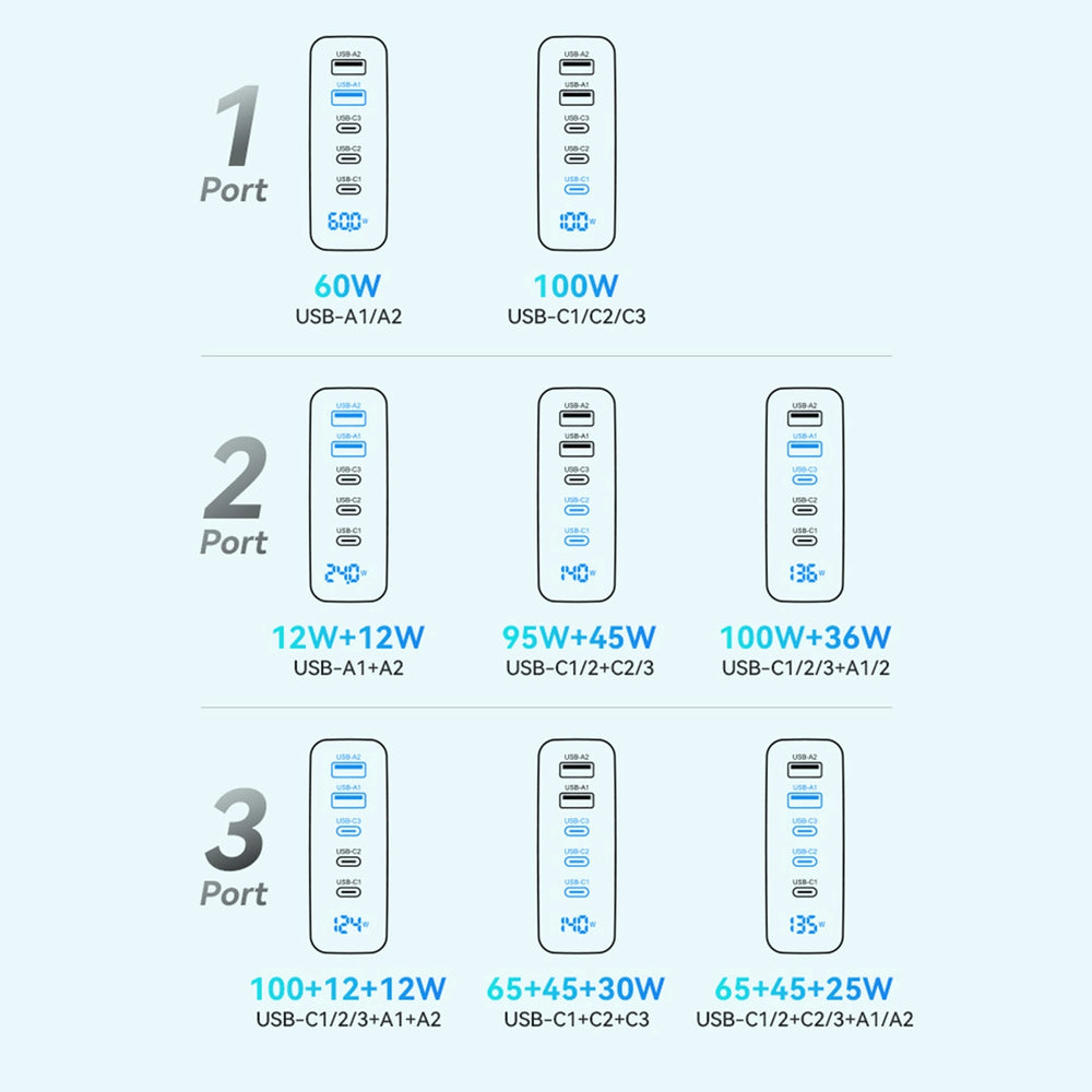 - USB-C 1 / USB-C 2 / USB-C 3 + USB-A 1 + USB-A 2: 100W + 12W + 12W