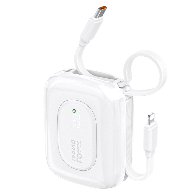 The Dudao K32 Power Bank is a reliable power source housed in an elegant white casing. With a capacity of 10,000 mAh and output of up to 22.5 W, it quickly charges your smartphone, tablet, or other mobile devices. Built-in USB-C and Lightning cables mean you can forget about extra wires, while a clear LED display shows the current charge level. Its compact design and practical carrying cord make the Dudao K32 the perfect companion for travel, work, and everyday use.