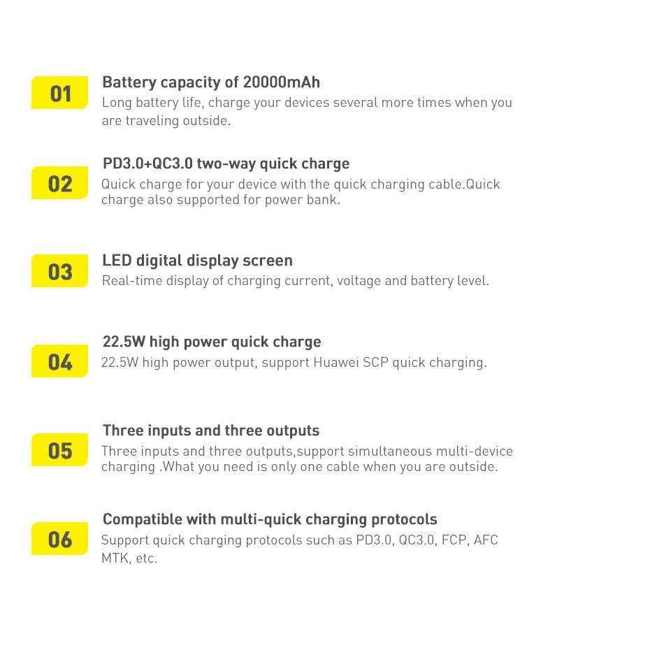 Die Baseus Powerbank unterstützt viele Schnellladestandards, darunter: Mit SCP, Quick Charge 3.0, Power Delivery 3.0. Es verfügt über zwei integrierte USB-A-Ausgangsanschlüsse, einen USB-C-Ein-/Ausgangsanschluss sowie Lightning und Micro-USB-Eingänge. Das Produkt unterstützt einen maximalen Ausgangsstrom von 22,5 W. Die LED-Anzeige am Gehäuse zeigt den aktuellen Betriebsstrom und den Ladezustand der Batterie an. Der integrierte Schaltkreis unterstützt mehrere Schutzmechanismen, die angeschlossene Geräte vor Schäden schützen.