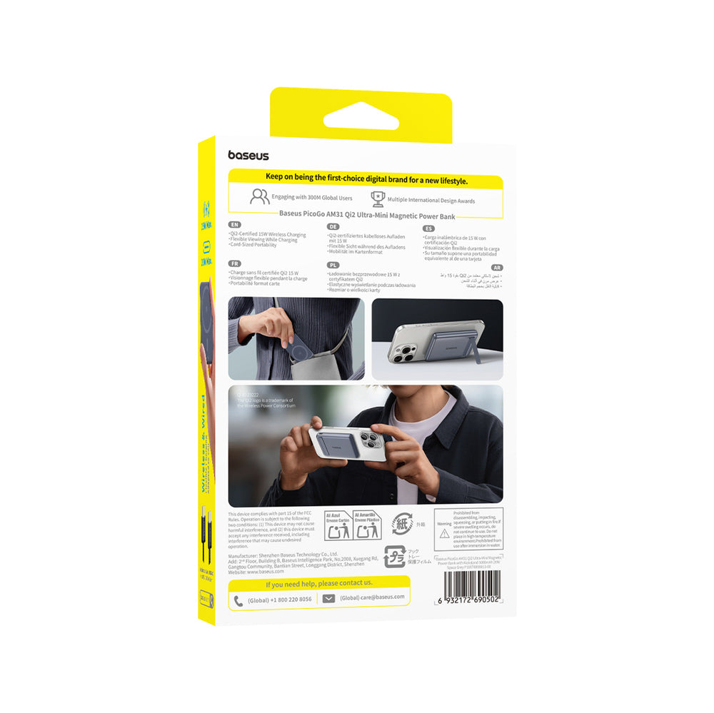 The ultra-slim Baseus PicoGo AM31 Qi2 power bank is the perfect combination of mobility, modern design, and incredibly convenient magnetic charging. Support for the Qi2 standard ensures a stable fit for your iPhone and faster, more efficient wireless charging up to 15W. The built-in stand allows for convenient use of your phone, while 20W wired charging shortens charging times. Crafted from aluminum and silicone, the device impresses with its durability and elegant, compact form—ideal for everyday use and travel.