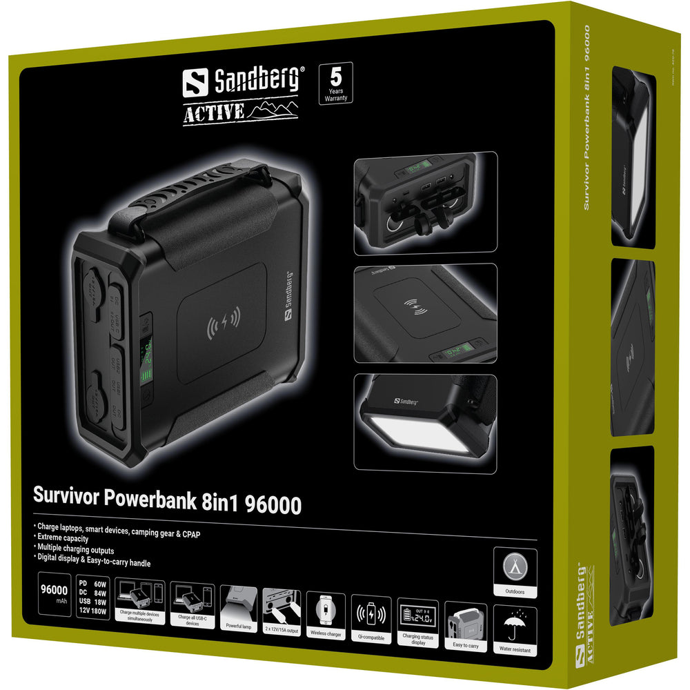 Sandberg Survivor Powerbank 8in1 96000, 96000 mAh, Trådløs opladning, Sort