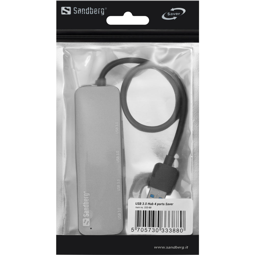 Sandberg USB 3.0 Hub 4 ports SAVER, USB 3.2 Gen 1 (3.1 Gen 1) Type-A, USB 3.2 Gen 1 (3.1 Gen 1) Type-A, 5000 Mbit/s, Sølv, Aluminium, 40 g