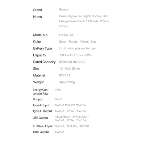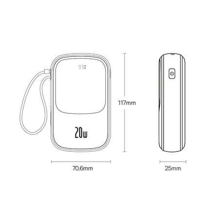 Powerbank 10000mAh 20W Baseus Qpow Pro Overseas Edition + USB C 3A Kabel - sort