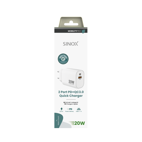 Sinox PRO 230V USB-A+USB-C oplader 20W. Hvid