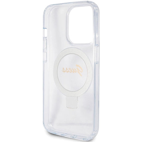 Guess Ring Stand Script Glitter MagSafe-hylster til iPhone 15 Pro - gennemsigtigt