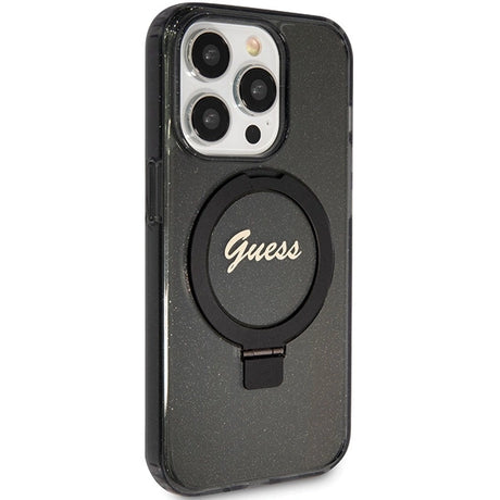 Guess Ring Stand Script Glitter MagSafe-hylster til iPhone 15 Pro Max - sort