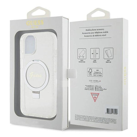 Guess Ring Stand Script Glitter MagSafe-hylster til iPhone 15 / 14 / 13 - gennemsigtigt