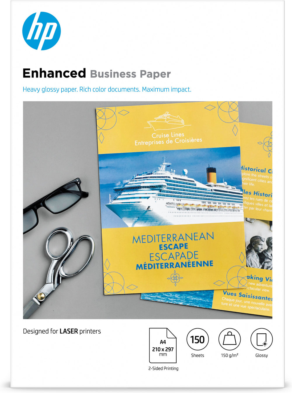 Print projects with a professional look and feel on both sides. HP Enhanced Business Paper, Glossy is FSC certified[1] and provides crisp, black text and sharp color graphics on sales presentations, brochures, and proposals.