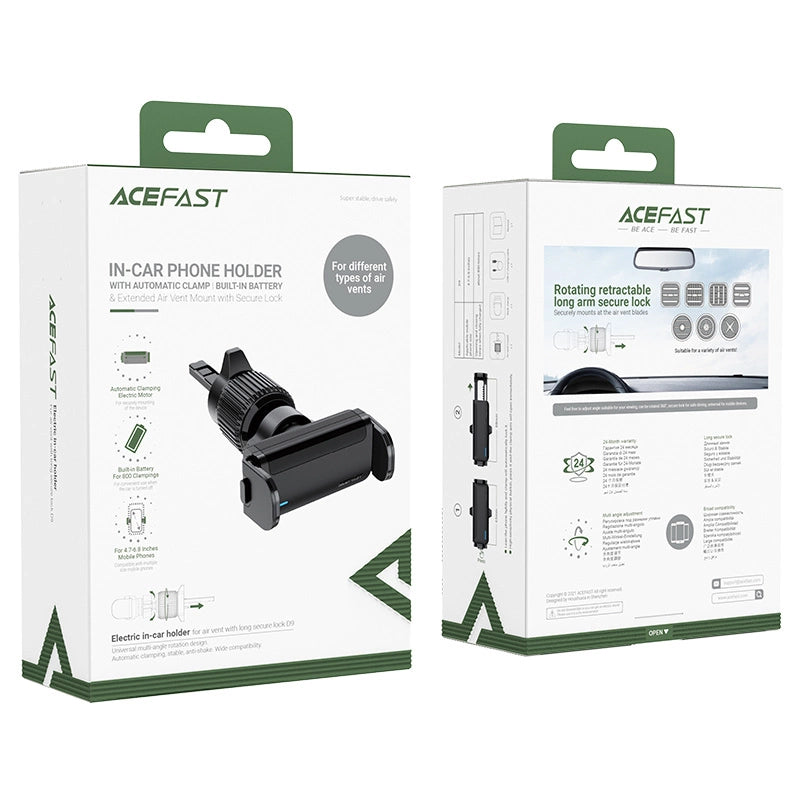 Convenient to use , easy to install, suitable for many phone models . The Acefast D9 automatic car holder can be mounted in the ventilation grille - a solution that fits many cars. Just connect the holder to the car charger and it will automatically clamp its jaws. Importantly, the handle will also close when you do not have access to electricity. The device has a built-in battery with a capacity of 250 mAh .