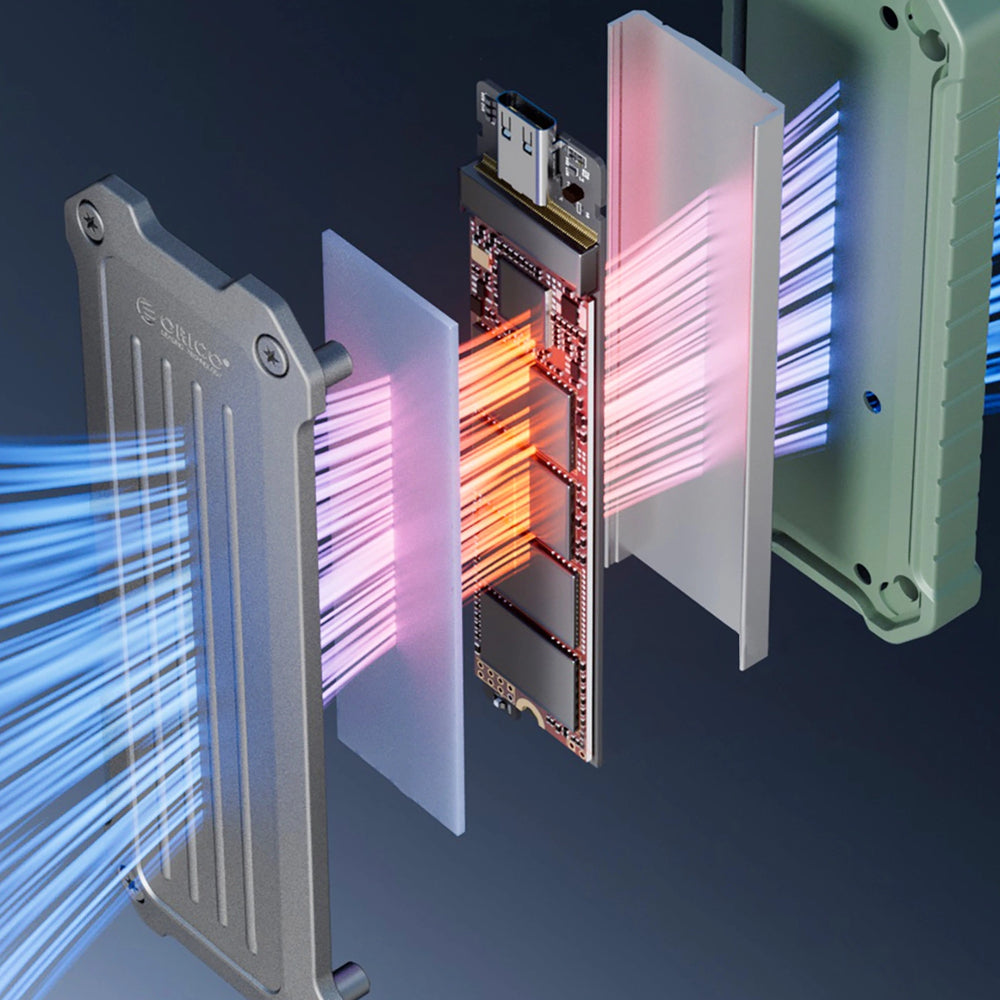 Orico OTPX-G2 wykorzystuje zaawansowany system chłodzenia z fins oraz thermal pad, aby utrzymać odpowiednią temperaturę pracy, nawet podczas długotrwałego użytkowania. Dzięki temu dysk SSD zachowuje wydajność i nie przegrzewa się, zapewniając stabilną pracę przez cały czas.