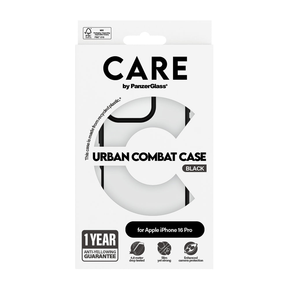 CARE by PanzerGlass® Flagship Case Transparent Urban Combat m. Sort Ramme iPhone 16 Pro