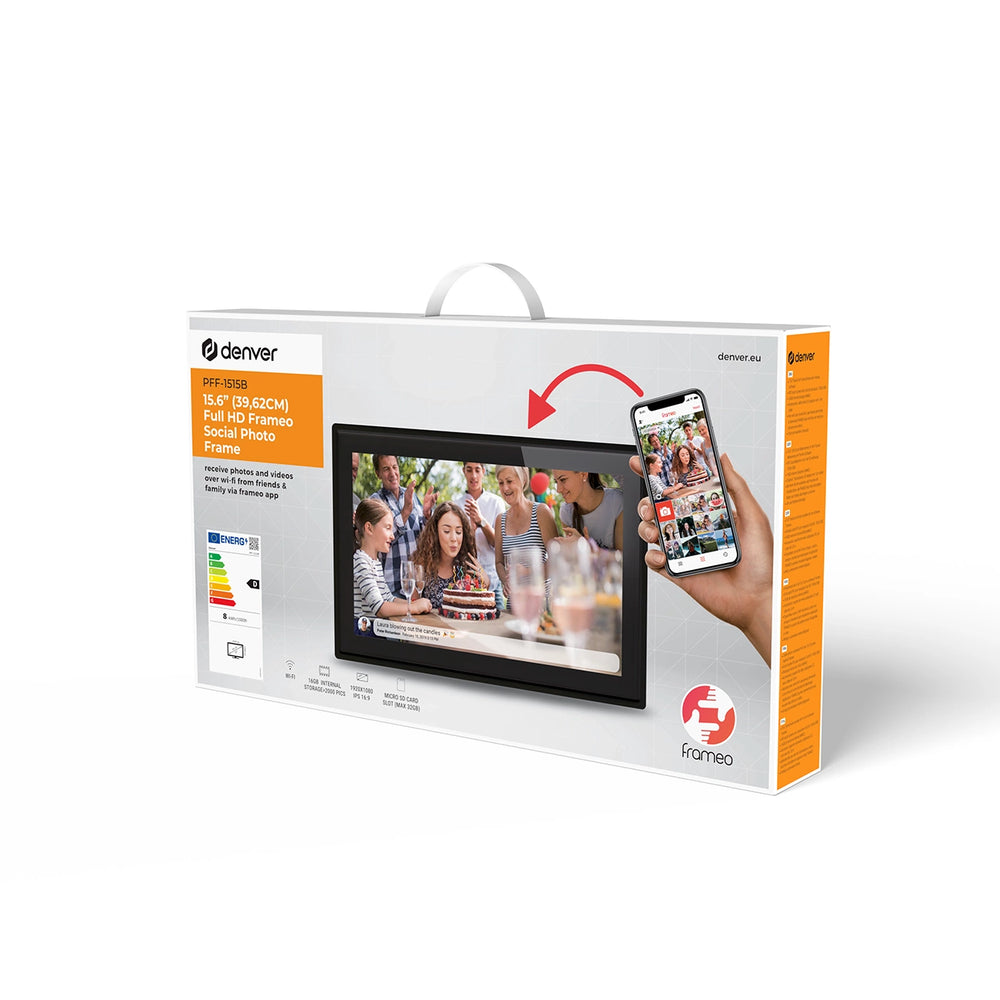 The Denver Frameo PFF-1515B digital photo frame is an elegant way to share and store your most precious memories. With a 15.6-inch IPS Full HD screen with a resolution of 1920x1080, the frame provides perfectly reproduced colors and sharp details. It is equipped with FRAMEO software, which allows you to quickly transfer photos and videos directly from your phone via Wi-Fi, so you can share moments with family and friends. With 16 GB of memory, the frame will hold hundreds of photos and videos that you can view in any way you like. The built-in timer and automatic shutdown option ensure that the frame saves energy and adapts to your daily rhythm. The Denver Frameo PFF-1515B is the perfect gift or elegant decorative element for your home!