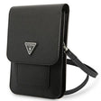 Branded smartphone bag is made of ecological leather with a luxurious Saffiano texture, closed with a magnetic clip, finished with a triangular Guess logo. It has a detachable shoulder strap, four pockets for cards / documents and two compartments for a smartphone.
