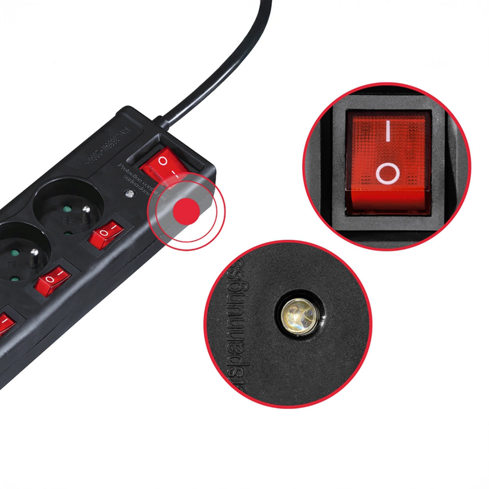 Discover reliable protection for your electrical devices with the Hama 6-socket surge protector with individual switches. This elegant and functional product in black is not only safe, but also convenient and energy-efficient. Equipped with integrated surge protection, this strip effectively protects your devices from voltage spikes and electrostatic charges. Ideal for use at home, in the office or in the workshop, it provides full control thanks to individual, illuminated switches for each socket. Benefit from the durability and reliability that Hama offers.