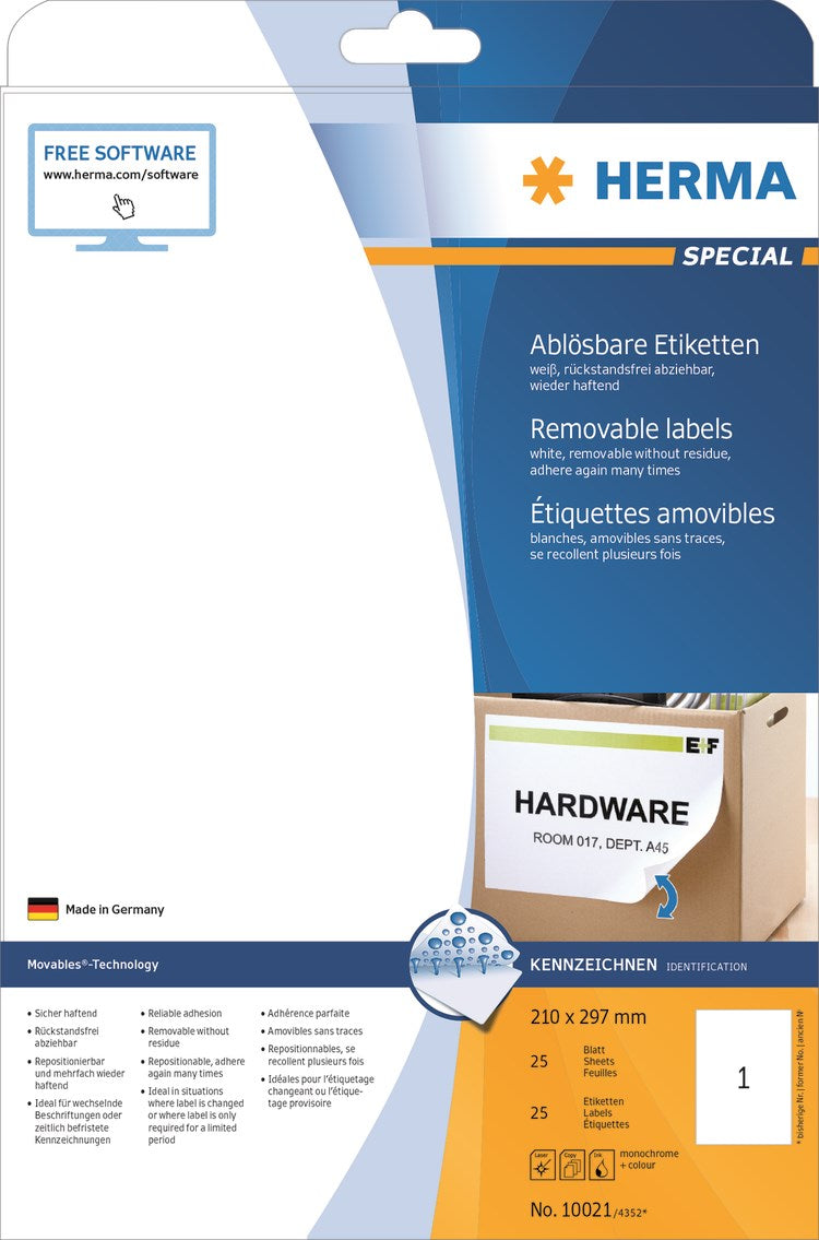 Flytbare etiketter på A4 ark, anvendes på tørre, glatte, støvfri flader. Kan fjernes igen uden at efterlade rester. Kan benyttes i blæk- og laserprintere samt kopimaskiner. 25 ark pr. pakke. Gratis softwaretilbehør: www.herma.com/software.