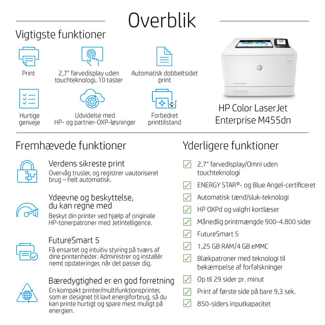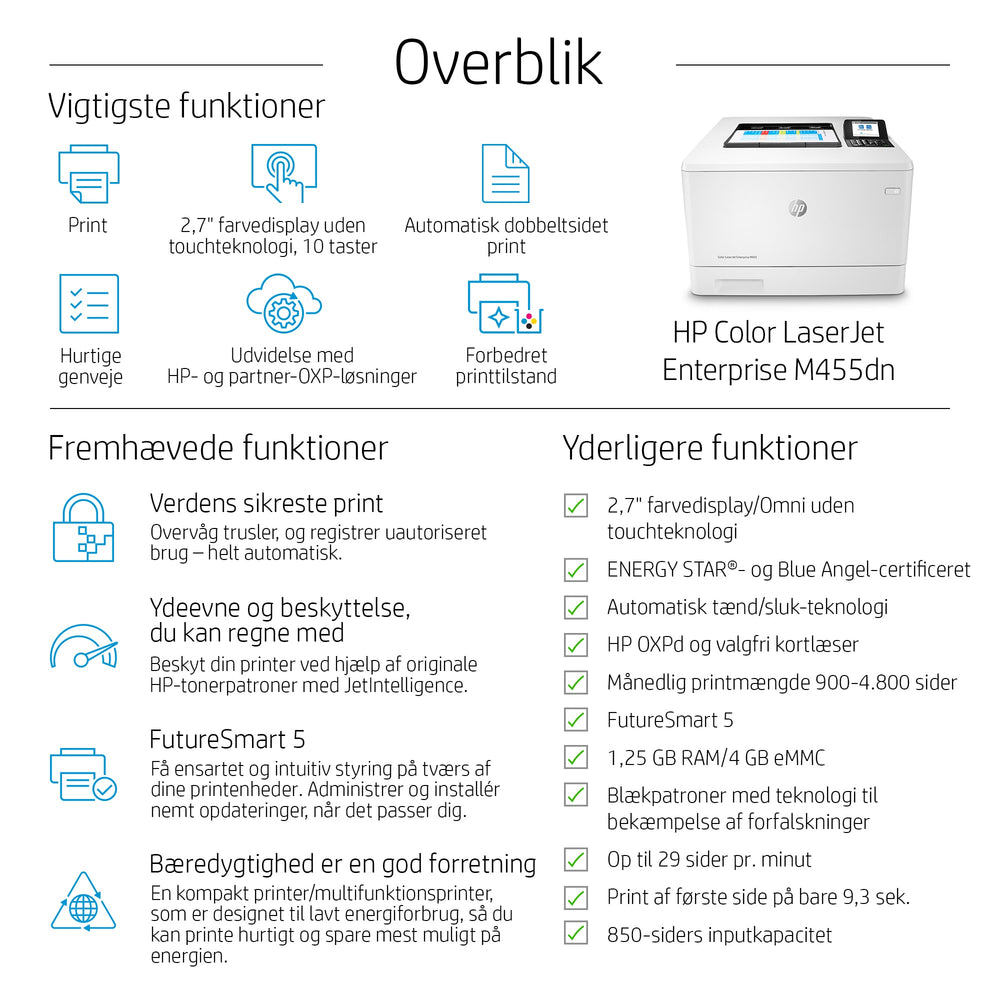 HP Color LaserJet Enterprise M455dn. Udskrivningsteknologi: Laser, Farve. Antal printpatroner: 4, Maksimal driftscyklus: 55000 sider pr. måned. Maksimal opløsning: 600 x 600 dpi. Maksimal ISO A-serie papirstørrelse: A4. Udskrivningshastighed (sort, normal kvalitet, A4/amerikansk papirformat): 27 sider pr. minut, Duplex udskrivning. Skærm: LCD. Netværk klar. Produktfarve: Hvid