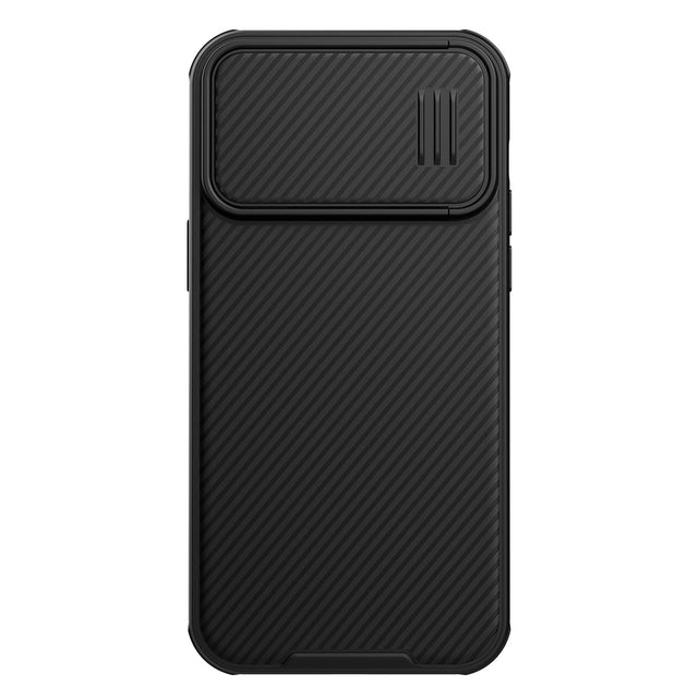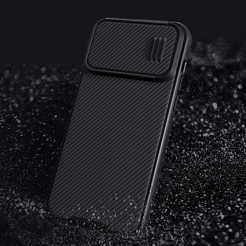 Armored iPhone 14 Pro Max case from the Nillkin CamShield S Case series with a black camera cover