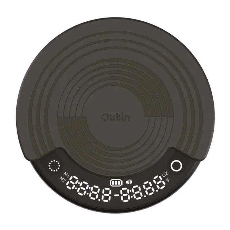 A finger touches a button on a round black Outin brand electronic scale, next to a bowl of coffee beans