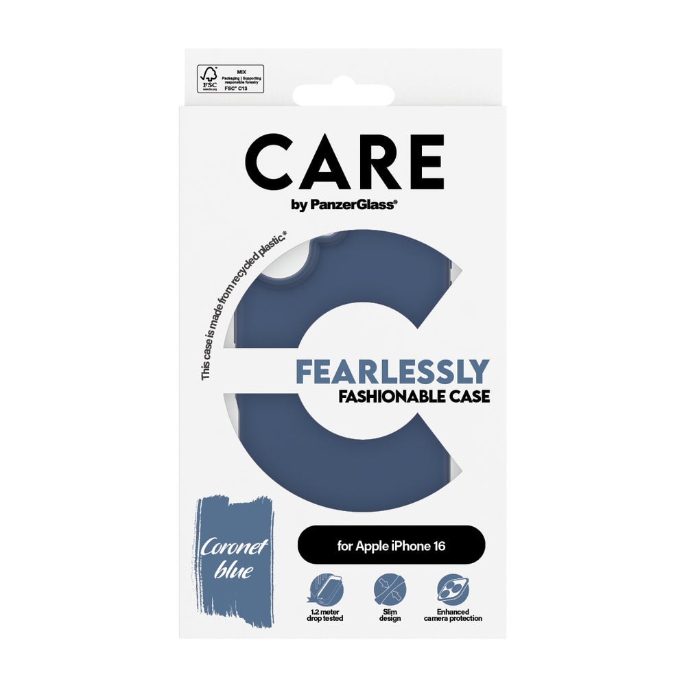 PanzerGlass CARE by ® Fashionable Case Blå iPhone 16, Apple, Apple - iPhone 16, Tør påføring, Ridseresistent, Stødresistent, Transparent, 1 stk