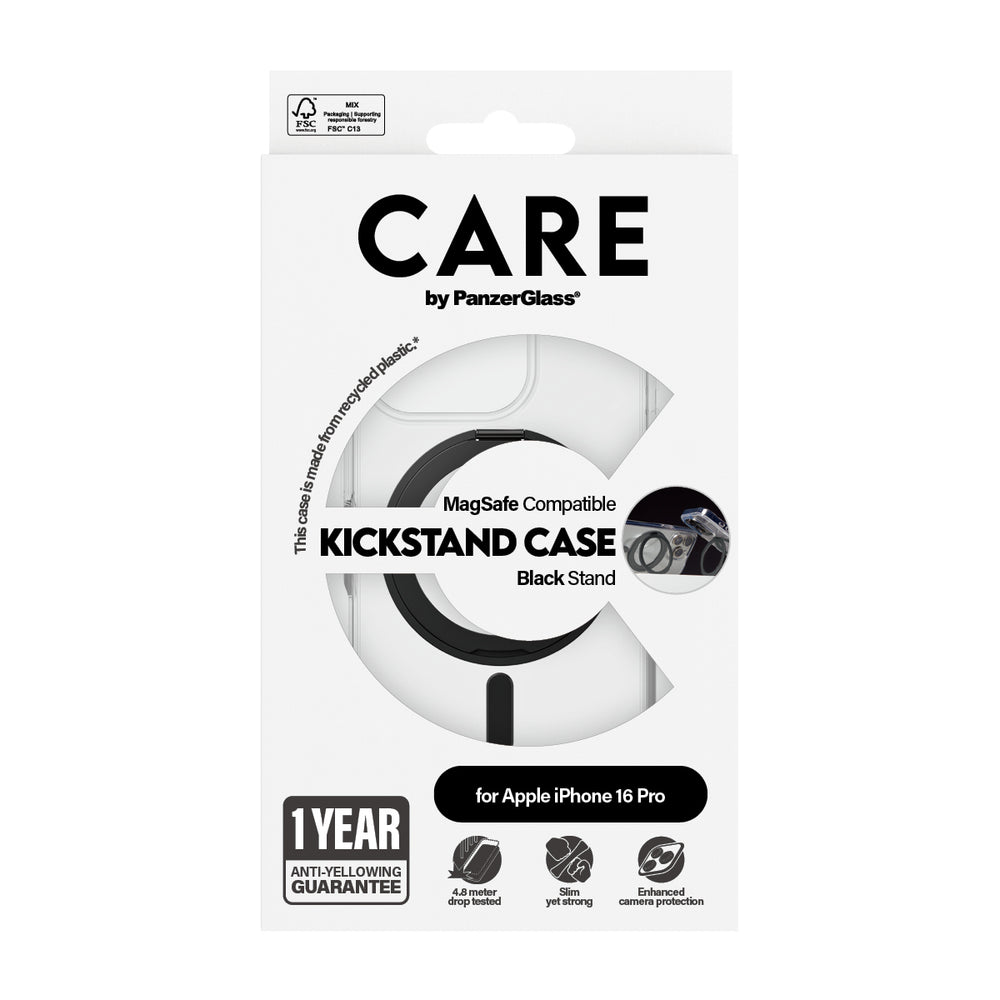 PanzerGlass CARE by ® Feature Case Transparent m. Sort Kickstand & MagSafe iPhone 16 Pro, Apple, Apple - iPhone 16 Pro, Tør påføring, Ridseresistent, Stødresistent, Transparent, 1 stk