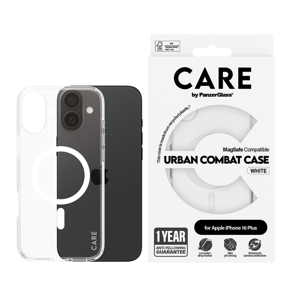 PanzerGlass CARE by ® Flagship Case Transparent Urban Combat m. Hvid MagSafe iPhone 16 Plus, Apple, Apple - iPhone 16 Plus, Tør påføring, Ridseresistent, Stødresistent, Transparent, 1 stk