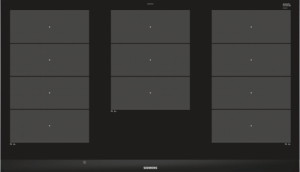 Siemens EX975LXC1E. Produktfarve: Sort, Rustfrit stål, Placering af apparat: Indbygget, Komfurtype: Zone induktionskogeplade. Kontroltype: Berøring, Kontrolposition: Front, LED-indikatorer: Strøm. Tilsluttet belastning (elektrisk): 11100 W, Vekselstrømsindgangsspænding: 220-240 V, Vekselstrømsindgangsfrekvens: 50 - 60 Hz. Bredde: 912 mm, Dybde: 51 mm, Højde: 520 mm