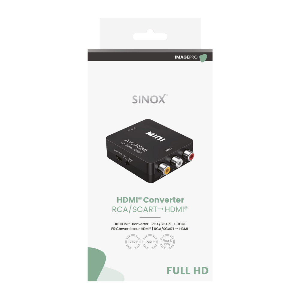 Sinox RCA/Scart til HDMI™ omformer er en universel omformer til analoge input og HDMI 720p/1080p (60Hz) digital output. Den analoge til digitale konvertering anvender 10 bits maximal 162MSPS sampling, autodetecting og auto-konvertering af composite signal til 1080p (60Hz) output. Den leverer den skarpeste og mest realistiske HD-gengivelse. Gense dine VHS/analoge minder i digital udgave.