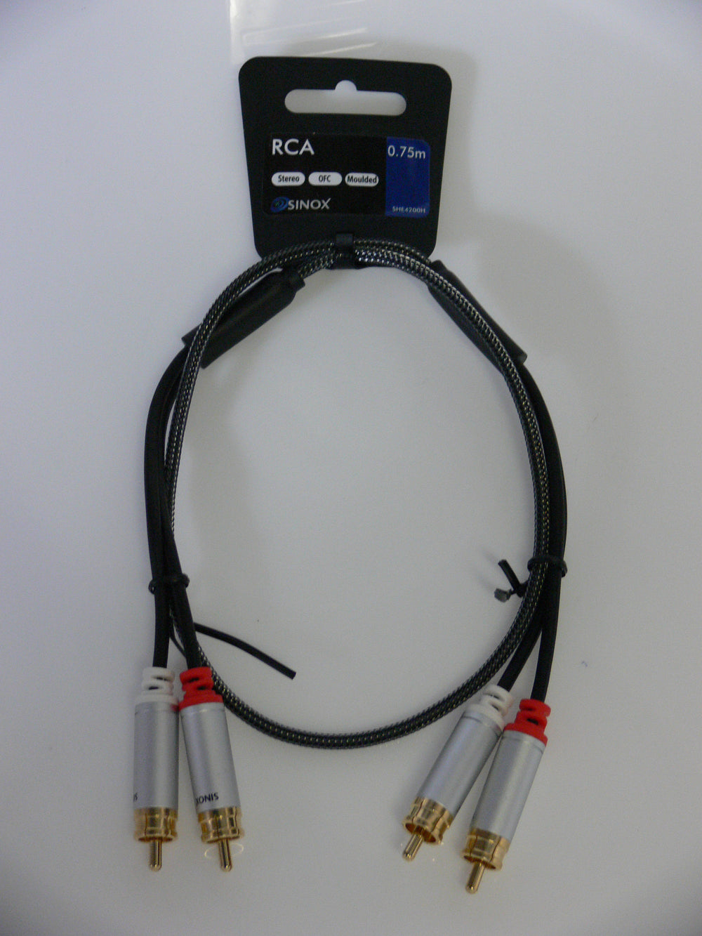 Sinox Phono kabel kan bruges til at overføre et audiosignal fra en CD, pladespiller til en forstærker. Både kvaliteten af stik og kabel spiller en store rolle for lydkvaliteten.