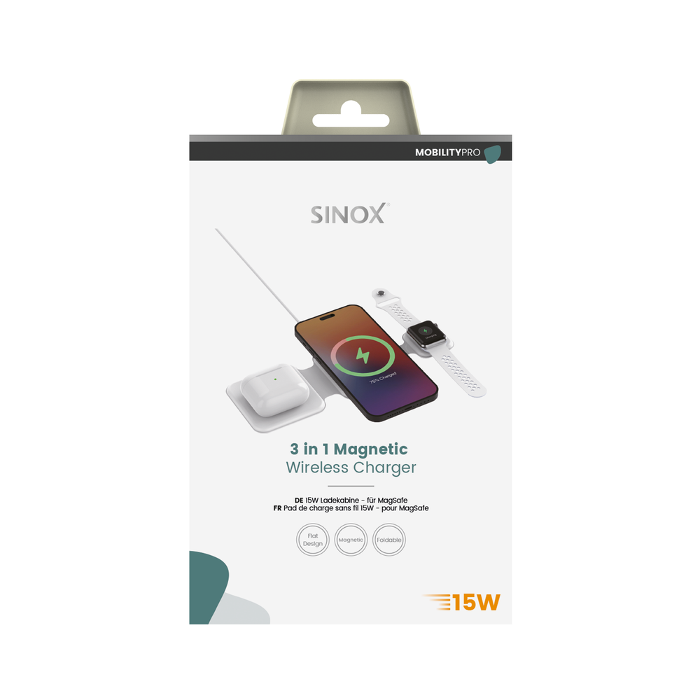 Sinox PRO 3-i-1 trådløs 15W lader. 1m. Hvid .